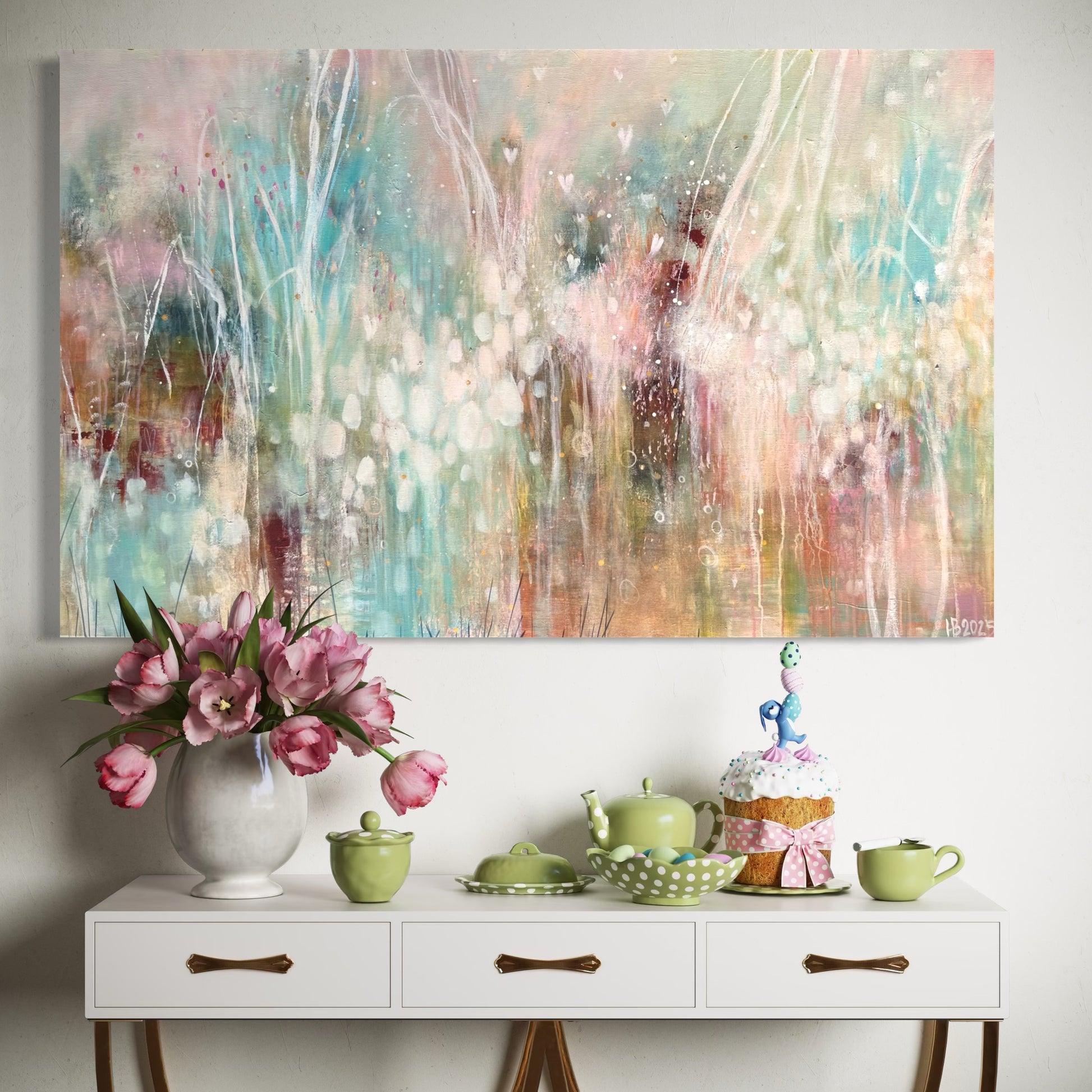 2025, 85x135cmx4cm, akryyli, tempera ja öljy pellavakankaalle. Maalaus jatkuu reunojen yli. Teos on ripustusvalmis.